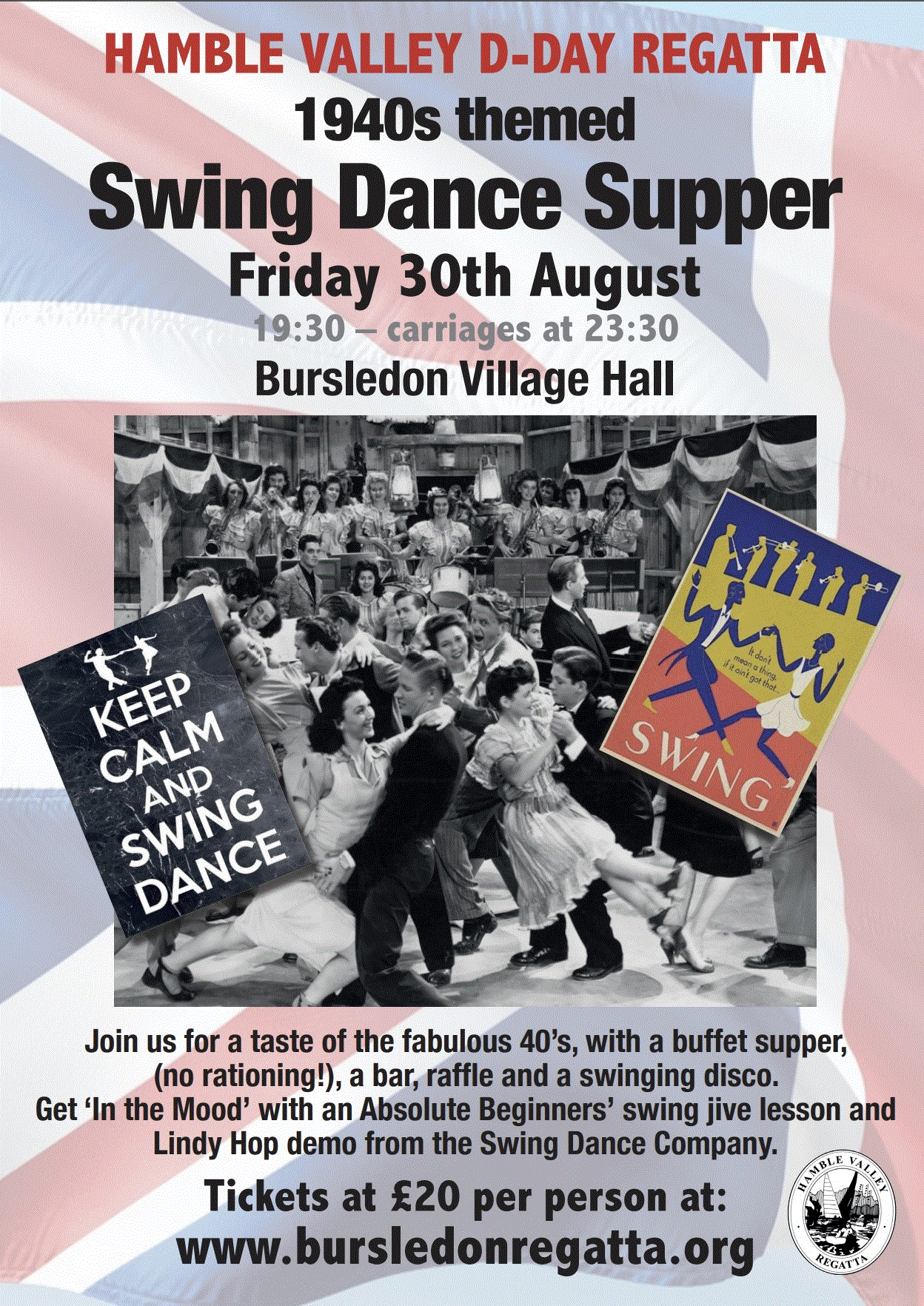 In support of the Regatta, including the villages of Hamble, Bursledon, Swanwick and Warsash, we are recreating that wartime spirit at Bursledon Village Hall. There’ll be a disco to dance to, and the popular Swing Dance Company will give you a taste of those heady swing dance days with an Absolute Beginners jive lesson and an energetic Lindy Hop demo. A finger buffet will be provided along with a Bar, and also a raffle with generous prizes donated by local businesses.